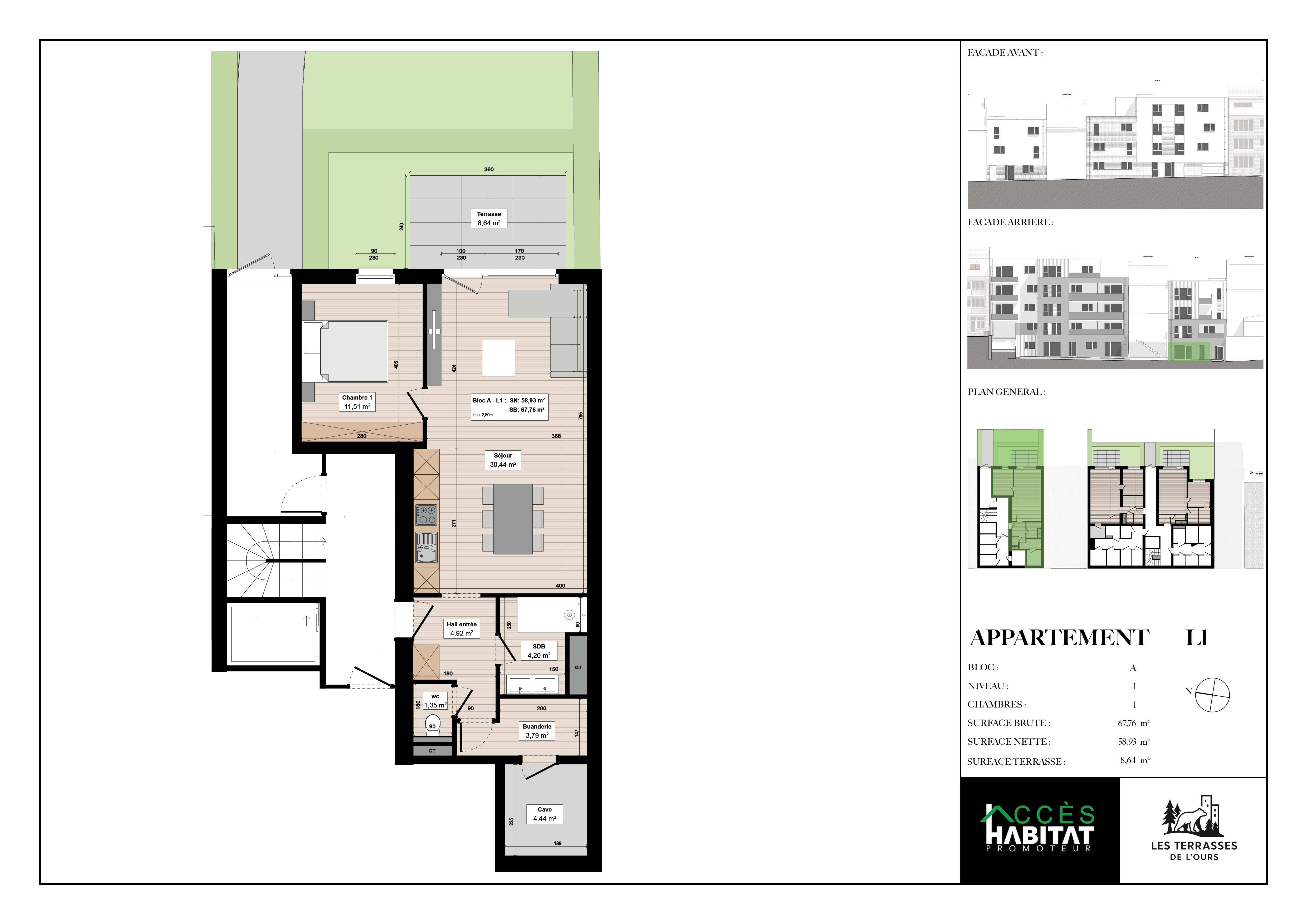 Cet appartement une chambre en rez-de-chaussée a été conçu pour offrir des espaces harmonieux et fonctionnels. Il se compose d’un séjour lumineux avec cuisine entièrement équipée, d’une buanderie, d’une salle de douche moderne et d’une agréable terrasse offrant une vue dégagée sur le poumon vert de la ville, propice au calme et à la détente.